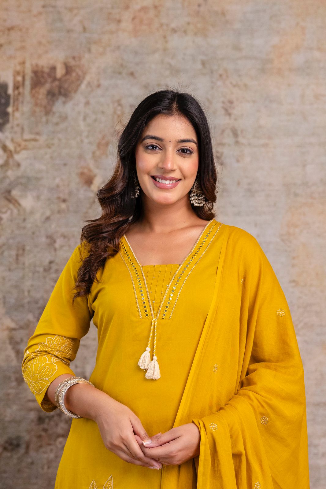 Elevate your festive and everyday style with this elegant mustard yellow embroidered kurta set. Crafted from premium breathable cotton, the set features a beautifully hand-embroidered straight kurta with floral motifs, paired with matching pants for all-day comfort. The look is completed with a lightweight, flowy dupatta adorned with delicate embroidered butis, adding a touch of grace to your ethnic wardrobe.