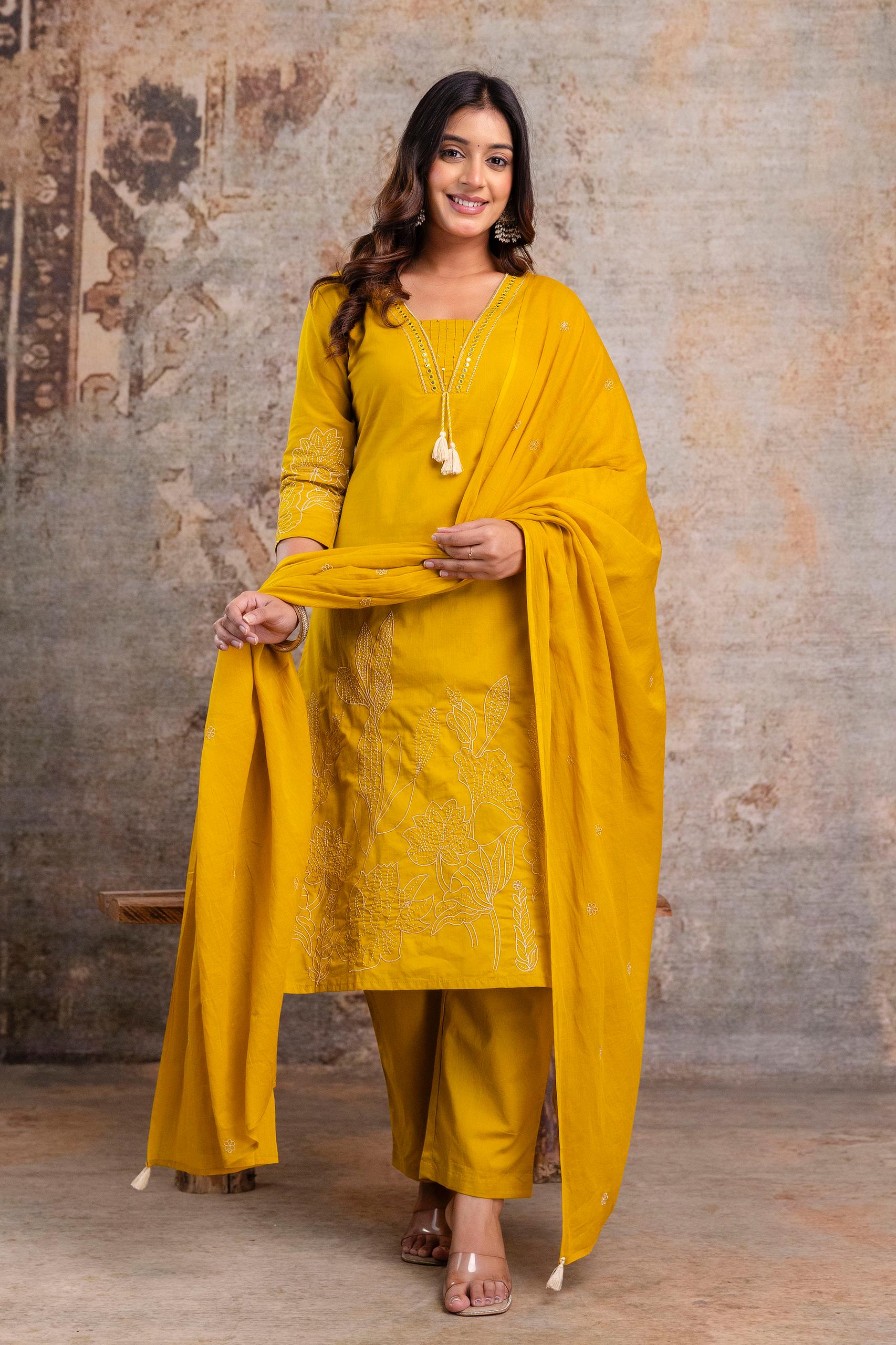 Mustard Yellow Embroidered Cotton Kurta Set with Dupatta – Women’s Ethnic Wear